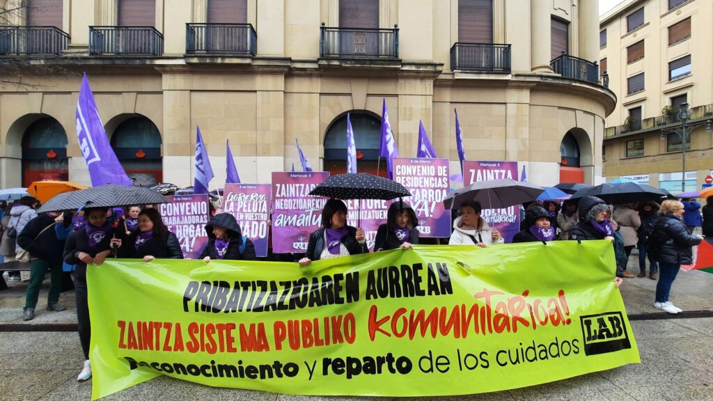 LAB ha realizado movilizaciones en Gasteiz, Iruñea y Baiona este 8 de mazo. Ante la privatización, el sindicato ha reivindicado un sistema de cuidados público y comunitario. La coordinadora general Garbiñe Aranburu ha participado en la movilización de Gasteiz, que ha arrancado desde la Plaza de la Provincia.