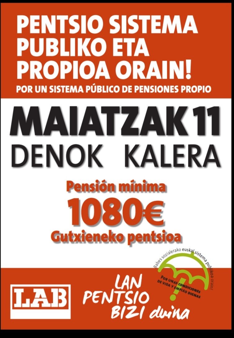 LAB se suma a las manifestaciones que el movimiento de pensionistas ha convocado para el próximo 11 de mayo en las cuatro capitales de Hego Euskal Herria y hace un llamamiento a participar en las mismas a toda su afiliación y militancia. El comité ejecutivo de LAB enviará delegaciones a las movilizaciones de Bilbo, Donostia, Gasteiz e Iruñea.