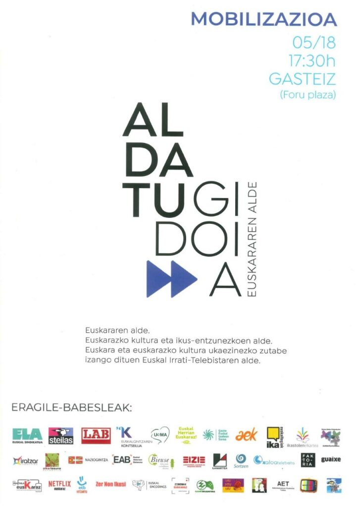– Larunbata 18, Aldatu Gidoia Euskararen Alde, mobilizazioa EITBn euskarak eta euskal kulturak dagokien tokia izan dezaten, 17:30ean Gasteizko Foru Plazan.