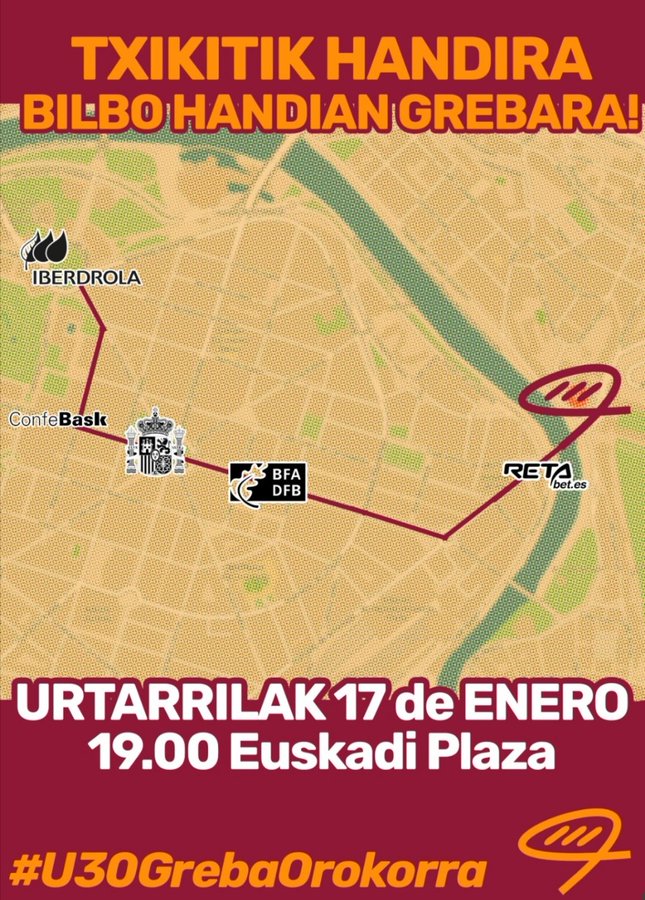 Partiendo desde la Plaza Euskadi, la movilización recorrerá la Gran Vía y en la misma se reuniran 11 comités de barrio Bilbao y comités de huelga de municipios colindantes. La Huelga General está cada vez más cerca y se realizará un llamamiento a llenar las calles de Bilbao el próximo 30 de enero.