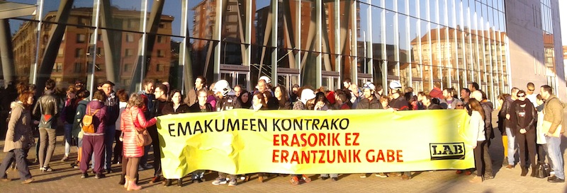 Hoy jueves, a las 9:00, se ha celebrado el último examen para conseguir una de las 60 plazas de bombero/conductor. Tanto los miembros del Tribunal examinador en calidad de representantes de la Diputación Foral de Bizkaia, como las personas aspirantes al funcionariado, entre quienes se encuentra el agresor indultado, se han dado cita en el BEC. Por eso, el sindicato LAB se ha concentrado a las puertas del examen para mostrar tolerancia cero a las agresiones sexuales, vengan de donde vengan.