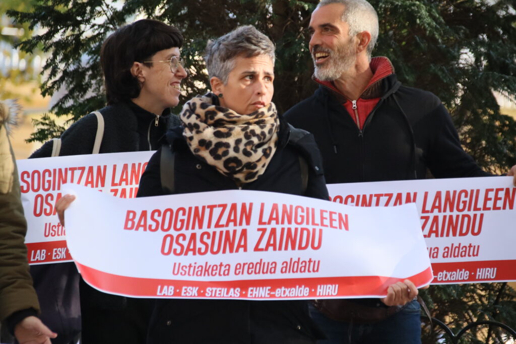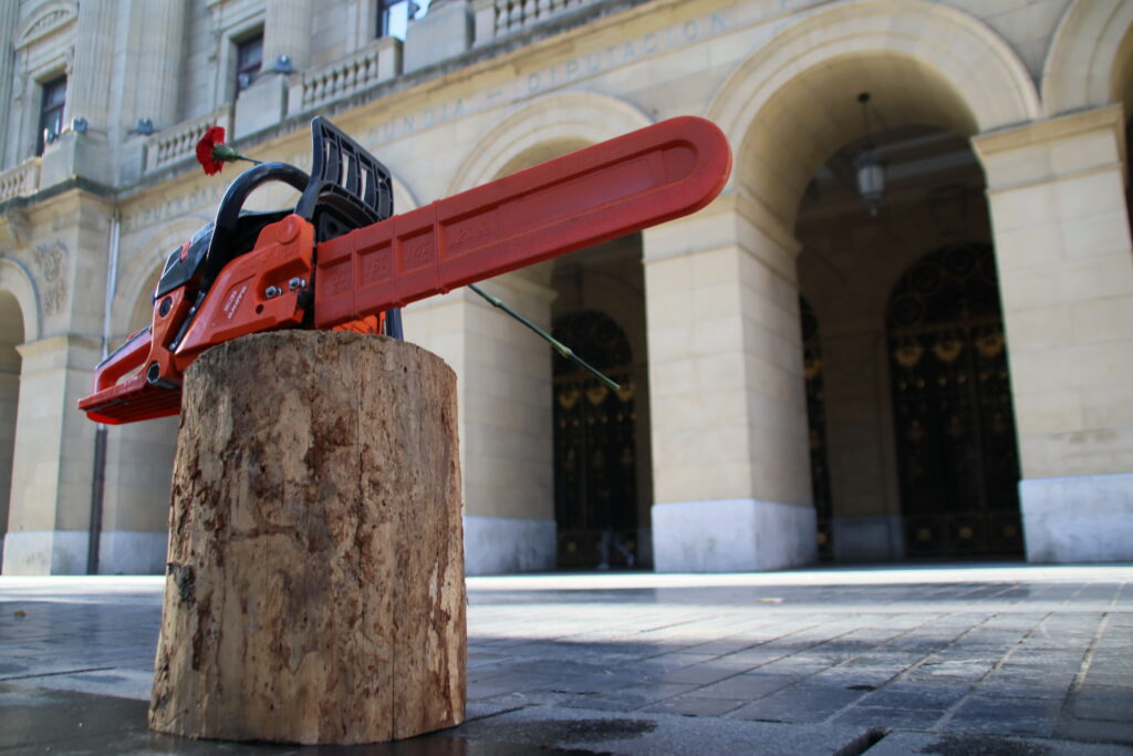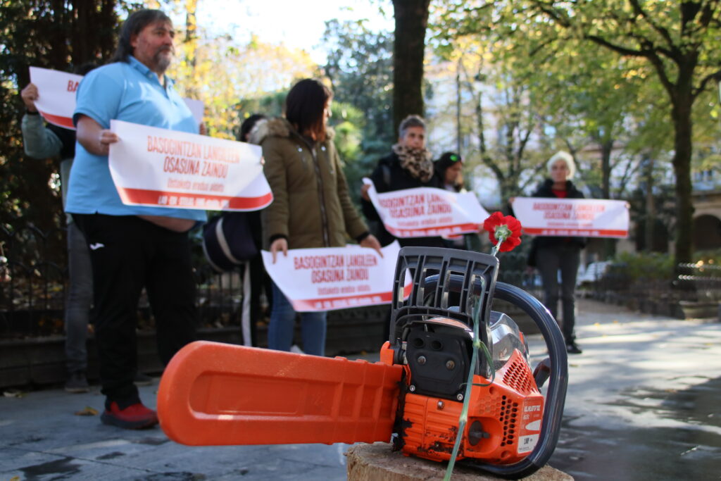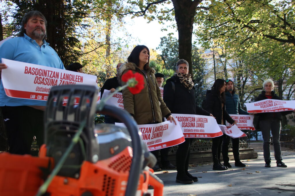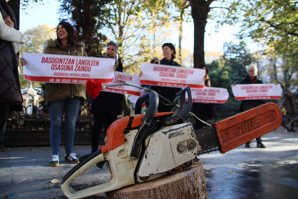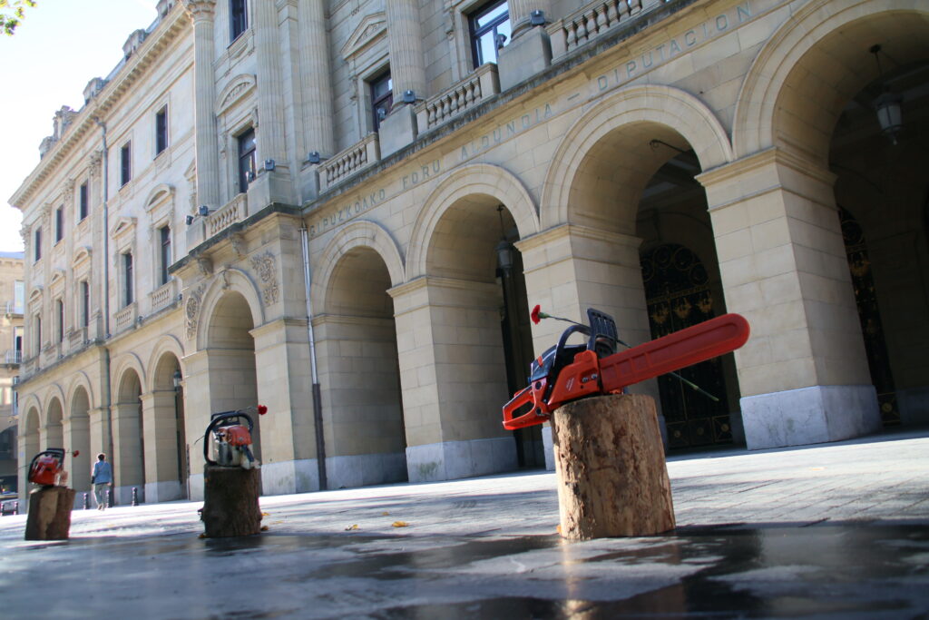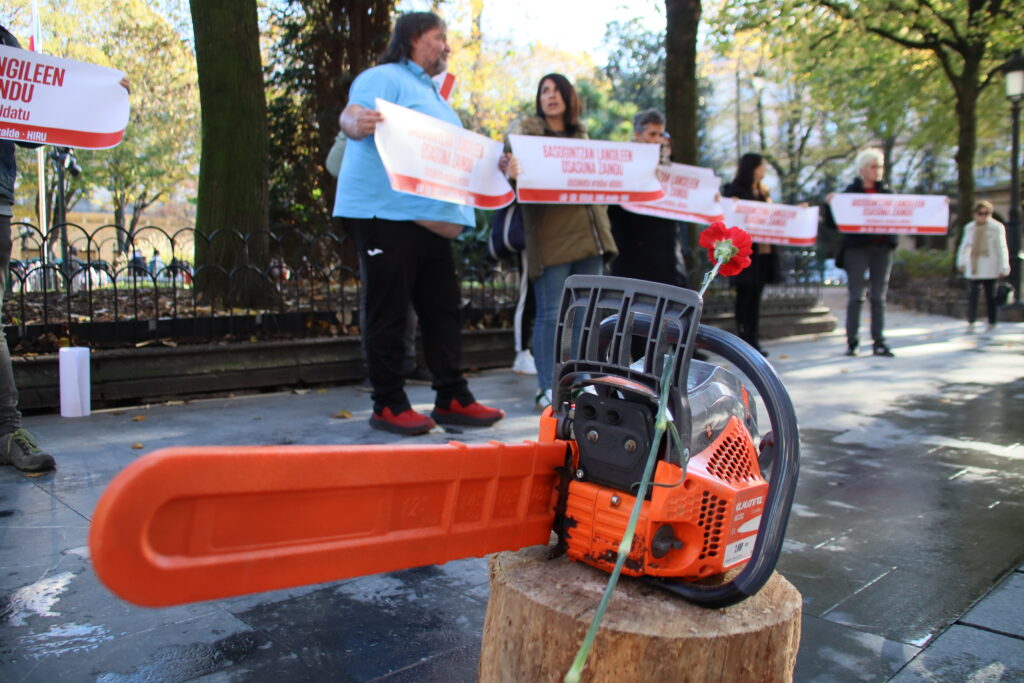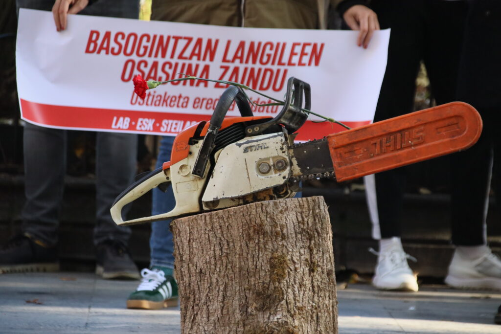 LAB, ESK, STEILAS, EHNE-etxalde e HIRU nos hemos movilizado hoy frente a la sede de la Diputación Foral de Gipuzkoa en Donostia con 3 troncos y otras tantas motosierras y claveles para denunciar las 3 muertes ocurridas en el sector forestal en lo que va de año. Asimismo, han registrado un escrito en las Diputaciones de Bizkaia y Gipuzkoa y en las Juntas Generales de ambos territorios, reclamando cuidar la salud de las y los trabajadores forestales y un cambio de modelo de explotación intensivo.