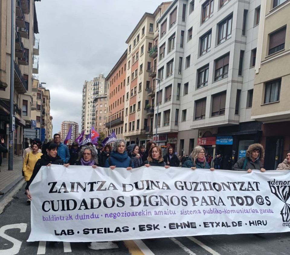 La dinámica Denon Bizitzak Erdigunean y los sindicatos LAB, STEILAS, ESK, EHNE, Etxalde e HIRU que formamos parte de la misma nos hemos movilizado hoy en Bilbo e Iruñea. Hemos denunciado la apuesta realizada por instituciones y patronales para profundizar en el modelo de la privatización y el negocio, ya que son las administraciones quienes ponen las garantías para que persista la privatización, y las empresas privadas, las responsables de la precarización de las trabajadoras de cuidados. Hoy hemos vuelto a interpelar a instituciones y patronales, porque estamos hartas de ver cómo en los trabajos de cuidados y con el negocio de unos pocos, se reproduce de forma sistemática la miseria de las mujeres* cuidadoras.