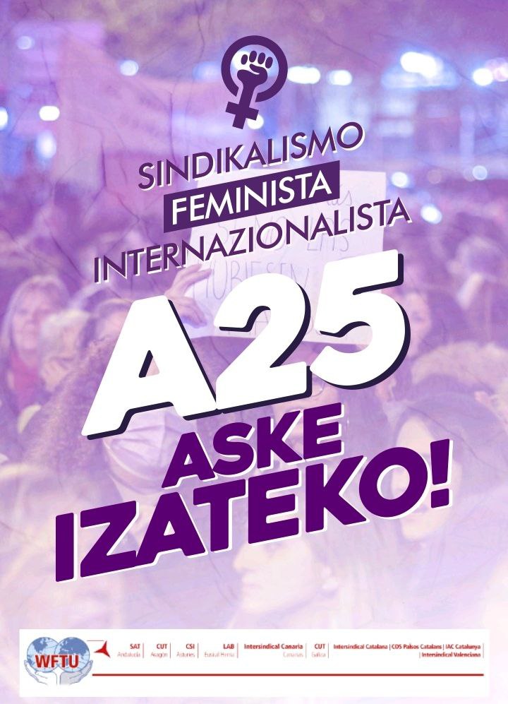 Emakumeen* aurkako indarkeria guztioi eragiten digun zerbait izanik, Munduko Federazio Sindikalaren Herrien Koordinakundetik, ezin dugu eta ez dugu estrategia indibidualik ezta isolaturik marraztu nahi. Gure artean indarrak batzen eta estrategiak biltzen ari gara, internazionalismo sindikalaren zentraltasuna berretsiz, eredu bidegabe, bortitz eta desorekatu baten aurka borrokatzen duten herrien artean zubi feministak sortzeko.
