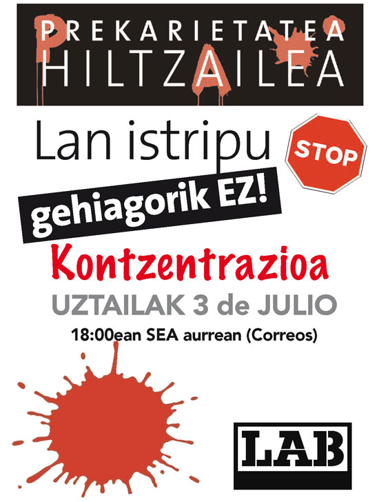 Hau guztia dela eta, LAB sindikatutik mobilizatzera dei egiten dugu eta guztien artean, langile zein jendartean odolhoste hau geldiarazi dezagun.