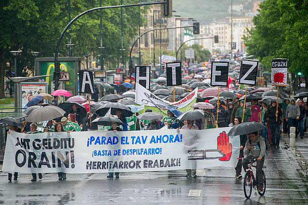 «8 urte igaro dira Abiadura Handiko Trena (AHT) egiteko lanak hasi zirenetik. Ordutik hona mito bat erortzen ikusi dugu. Urte hauetan zehar agerian gelditu da AHT ez dela bideragarria eta ez dakarrela inongo onurarik gizartearentzako. Porrot egin du proiektu honek, milioiak xahutzen dituena eta oinarrizko beharrizan sozialetara bideratu beharko liratekeen partidak murriztu beharra dakarrena, kalte itzela eraginez gizarte, ekonomia eta ingurumen arloetan.
