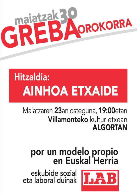 Datorren ostegunean, maiatzak 23, LABeko idazkari nagusia Algortan izango da sindikatu eta eragile sozial ezberberdinek deitu dugun greba orokorraz mintzatzeko. Hitzaldia Algortako Villamonteko Kultur Etxean izango da arratsaldeko 19:00etan.