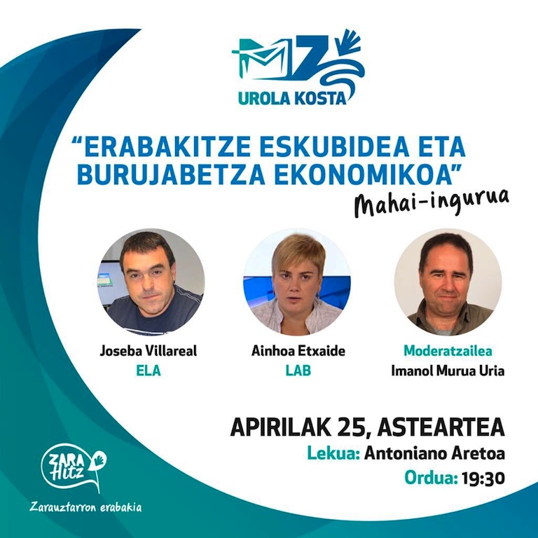 LABeko idazkari nagusiak solasaldi batean parte hartuko du bihar, apirilak 25, Zarautzen, ELAko ordezkari Joseba Villarealekin batera. Moderatzailea Imanol Murua Uria kazetaria izango da. "Erabakitze eskubidea eta burujabetza ekonomikoa" izango da mahai inguruaren izenburua, Zarauztarron Erabakia dinamikak antolatuta. Antoniano Aretoan egingo dute, 19:30ean. Urola Kostan bertan, Azpeitian, beste hitzaldi bat antolatuko dute asteazkenean; Ainhoa Etxaide ere izango da bertan, euskal esparru sozioekonomikoari buruz solasteko.