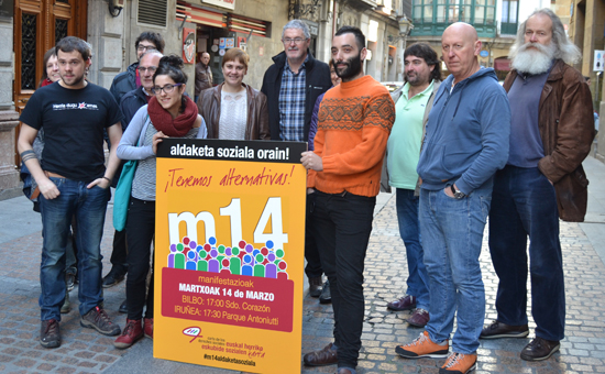 Eskubide Sozialen Karta, herritarron alternatiba, kalera ateratzera goaz. Mobilizazioa gure helburuak lortzeko ezinbestekoa dela esaten genuen eta hori praktikara eramatera goaz. Martxoaren 14an, Bilbo eta Iruñeara joateko deia egin nahi diogu aldaketa sozialaren alde dagoen orori. Bilboko manifestazioa Jesusen Bihotzean hasiko da 17:00etan eta Iruñekoa Antoniutti parkean 17:30ean.»
