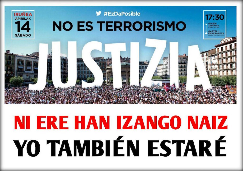 Terrorismotzat jotako gertakarien kalifikazioari, 375 urte batzen dituzten 12 eta 62 espetxe zigorren eskaerari eta duela 16 hilabete presoaldi prebentiboan dauden hiru gazteen egoerari gure errefusa adierazten dugu. Gertakariei ezarritako kalifikazio penalaren desegokitasunak, leporatze horiek eutsi ahal izateko behar diren betebehar juridikoak ez betetzeak, proportzionaltasun-faltak eta tipo penalen interpretazio hedakorrek pertsona guztiak babestu behar gaituzten askatasunak berme prozesalak eta segurtasun juridikoa urratzen dute, Instantzia batzuk salatu duten moduan, besteak beste, Nazio Batuen Erakundeko Giza Eskubideko Relatore batzuek, “Fair Trials” eta “Amnistia Internazional” erakundeek.