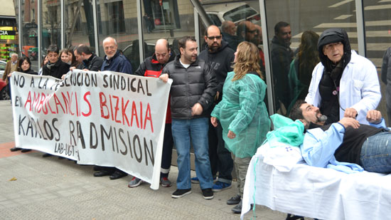 Ambulancias Bizkaia UTE enpresako LABeko ordezkari Carlos Diazen kaleratzea salatzeko protesta egin dute langileek Osasun sailaren egoitzan aurrean. Langileen ordezkaritza lanetan aritzea, horixe izan da Díaz kaleratzeko arrazoi bakarra, UTEaren kudeatzailearen aldetik abiatutako sorgin-ehizaren baitan.
