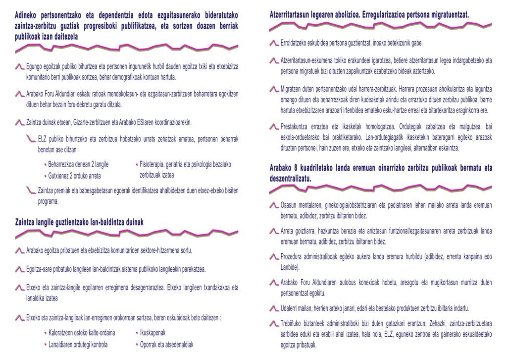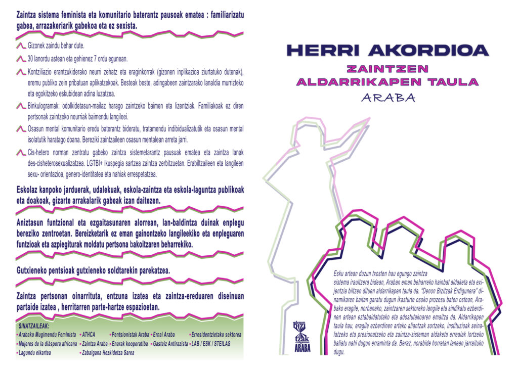 Duela astebete Gasteizen aurkeztu genuen Arabako Herri Akordioa–Zaintzen Aldarrikapen Taula. Egungo zaintza sistema iraultzera bidean Araban egin beharreko hainbat aldaketa eta exijentzia biltzen dituen aldarrikapen taula da. Denon Bizitzak Erdigunera dinamikaren baitan garatu dugun ikasturte ondoko prozesu baten ostean, Arabako eragile, norbanako, zaintzen sektoreko langile eta zenbait sindikaturen artean eztabaidatutakoaren eta adostutakoaren emaitza da. Mugimendu Feministarekin elkarlanean egon gara AEZLE (Arabako Etxeko eta Zainketako Langileen Elkartea), Pentsionistak, Enara Kooperatiba, Ernai, Harramazka gazte talde feminista, Zaintza Araba, LAB, ESK eta Steilas sindikatuak, eskualde ezberdinetako talde feministak, Lumagorri…