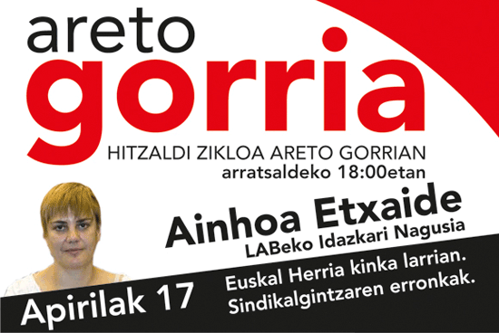 Bihar, apirilak 17, Areto Gorrian, LABen Ipar Hegoa Fundazioaren ekimenez Iruñean gogoeta eta eztabaidarako sortutako gune berrian Ainhoa Etxaide, LABeko idazkari nagusiak, Euskal Herrian jasaten ari garen garai gogorren aurrean sindikalgintzaren erronkak zeintzuk diren azalduko ditu. Hitzaldia arratsaldeko 18:00etan izango da eta streaming bidez ikusteko aukera izango da www.labsindikatua.org/aretogorria eta www.ateakireki.com webguneetan. Etzi, apirilak 18, Floren Aoiz idazleak "Más allá de 1512" izenburupean hitzaldia eskainiko du.
