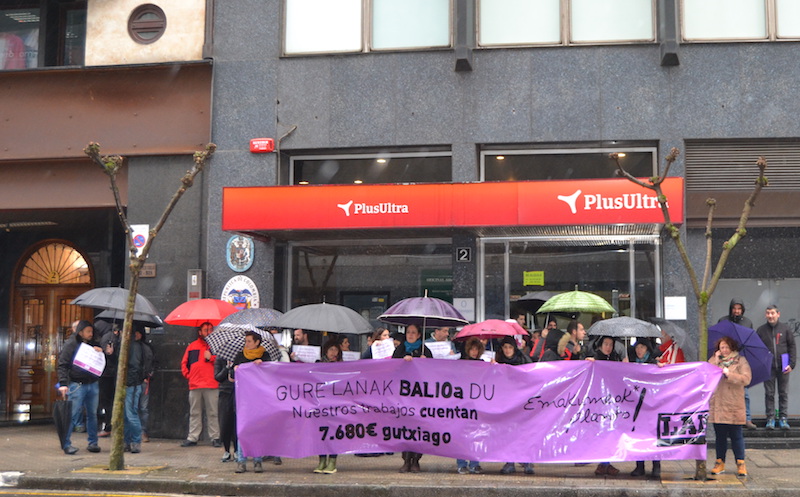 LABek elkarretaratze bat egin du gaur, Lan Harremanen Kontseiluaren aurrean, Bilbon, “Gure lanak balioa du, 7680 euro gutxiago. Emakumeok planto!” leloarekin. Hain zuzen ere, mobilizazio hau Eusko Jaurlaritzako Justizia eta Lan Departamentuak emakume eta gizonen arteko soldata arrakalari buruz hitz egiteko deitutako bilera egin bitartean gauzatu dugu. Bileran, LABeko bi kide izan dira, Batzorde Exekutiboko Arantxa Vazquez tartean, eta Gasteizko Legebiltzarrak egindako legez besteko proposamenaren inguruko irakurketa eta soldata arrakalari aurre egiteko neurriak proposatu ditugu. Confebaskek eta EAJk, berriz, ez dute ezer proposatu. Are eta gehiago, patronalak esan du soldata arrakalaren arazoa ez dela bere erantzukizuna, eta ez duela diskriminaziorik ikusten; EAJk, bere aldetik, patronala ez duela interpelatuko adierazi du. Martxoaren 12rako deitu dute hurrengo bilera, eta LABek egunotan baloratuko du bertara joan ala ez.