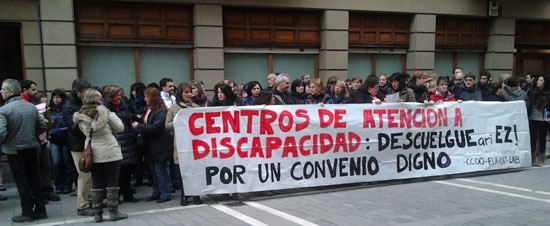 «CCOO, ELA, UGT eta LAB sindikatuok, maila guztietako ezintasun psikikoak nahiz fisikoak dituzten pertsonentzako zentroetako langileen lan baldintzak biltzen dituen Nafarroako herrialdeko lan hitzarmenarekin gertatzen ari dena salatzera gatoz, 800 bat langile eragindu daudelarik.