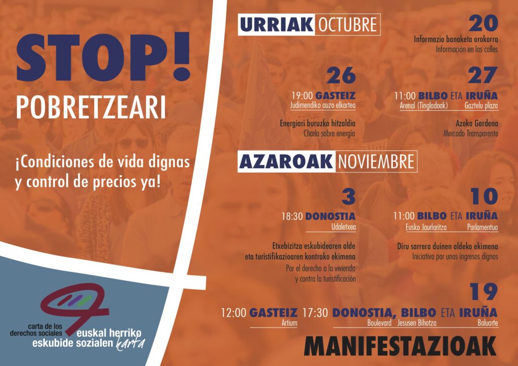 Aste honetan eta hurrengoan bi hitzordu garrantzitsu ditugu horretarako. Horrela, azaroaren 12an, 17:30ean Bilboko La Casillatik abiatuko den manifestazio nazionala egingo du EH Bilduk, “Euskal olatua: geldiezina” lemarekin eta azaroaren 19an, Euskal Herriko Eskubide Sozialen Kartak manifestazioak deitu ditu Hego Euskal Herriko hiriburuetan, “Pobretzeari stop! Bizi-baldintza duinak eta prezioen kontrola, orain!” lemarekin (12:00etan Gasteizko Artiumetik eta 17:30ean Donostiako Alderdi Ederretik, Bilboko Jesusen Bihotzetik eta Iruñeko Baluartetik). LABek dei egiten dio bere afiliaziora bi mobilizazioetan parte hartzera. Eraldaketa sozial eta aldaketa politikoaren aldeko indarrak bildu eta kaleak hartzera goaz.