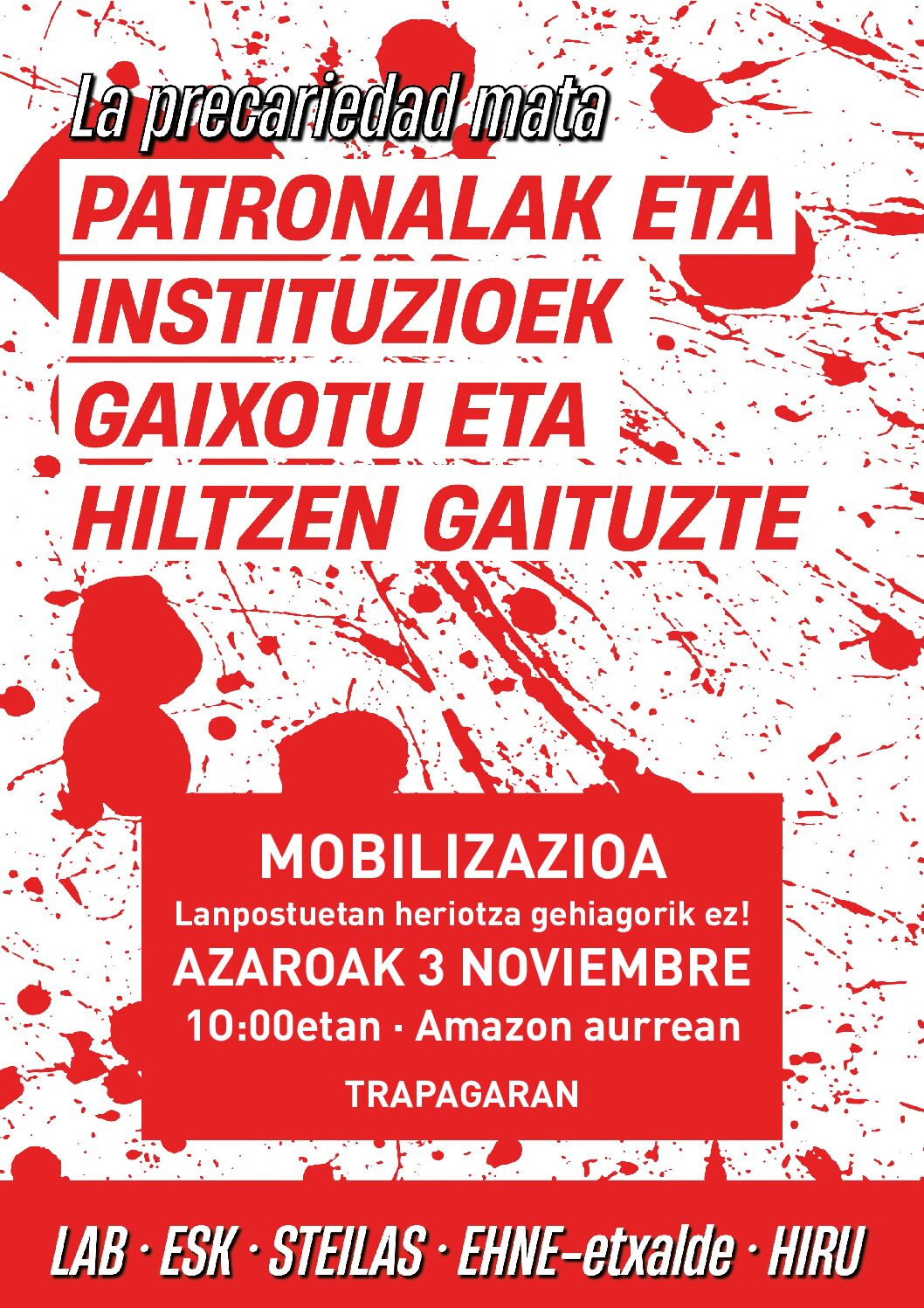 Honen aurrean argi daukagu mobilizazioa eta borroka dela bide bakarra. Horregatik, datorren azaroaren 3an goizeko 10etan mobilizazio batera deitzen dugu, Amazoneko instalazioen sarreran, LAB-ESK-STEILAS-ETXALDE-HIRU Sindikatuek deituta.