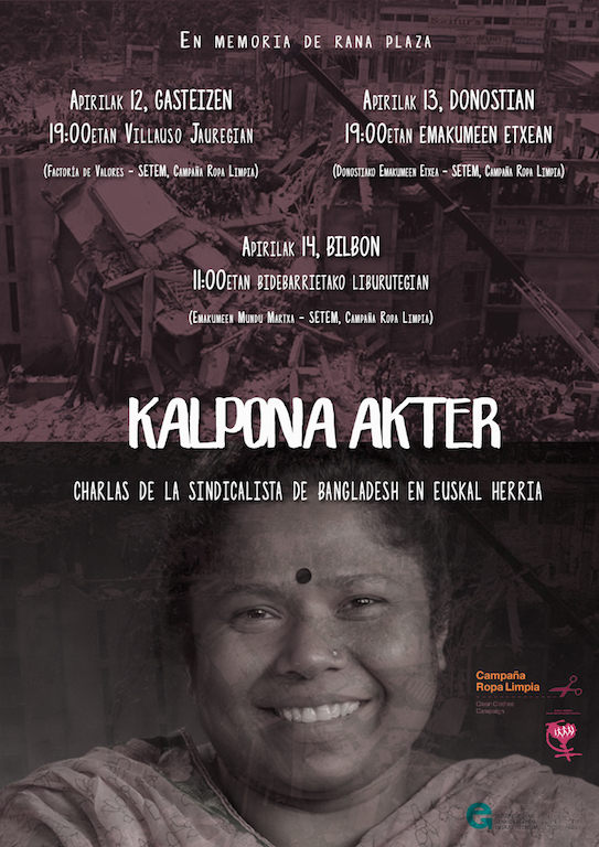 Euskal Herriko Emakumeon Mundu Martxak eta SETEM-ek, Nazioarteko Arropa Garbiaren Kanpainaren bitartez, Kalpona Akter sindikalistaren hitzaldi sorta bat antolatu dute datozen egunetarako: