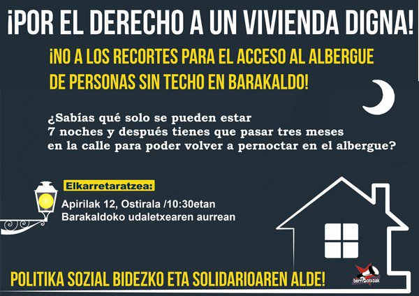 Zentzu horretan, heriotza hau salatzeko eta babes sozialeko politika errealak eskatzeko, antolatutako mobilizazioan parte hartzeko deia egiten dugu; apirilaren 12, Barakaldon, goizeko 10.30tan udaletxe aurrean, Berri Otxoak mugimendu sozialak deituta. Gainera, bazterketa sozialaren kontrako borrokan eta babes sozialeko euskal sistemaren aldeko borrokan berresten gara. Eskubide guztiak denontzat!