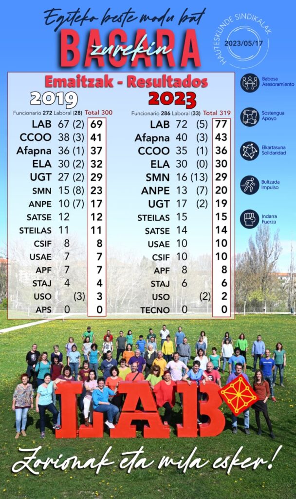 Bere aldetik, Imanol Karrera Nafarroako bozeramaileak aipatu du atzoko emaitzak ez direla “kasualitate hutsa”. “Klaseko lan sindikal baten emaitza dira, kontrabotere baten emaitza, langile guztiak batzen dituena eta kolektibo osoaren alde borrokatzen dena. Sindikalismo ezberdin bat, interes korporatiboengatik mugitzen ez dena. Gauzak egiteko beste modu bat duen sindikalismoa, koherentea, esaten duena egiten duena, eta konprometitua, egunerokoan betetzen duena”.