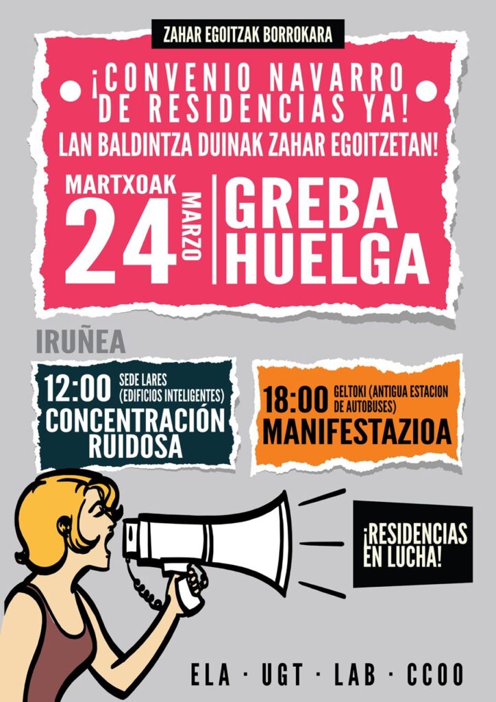 LABek, ELAk, UGTk eta CCOOk grebara deitu dugu martxoaren 24an eta 31n, Nafarroako adinekoen arretarako lehen hitzarmenaren azken bilerek ez dutelako lan-baldintza duinak eta kalitatezko zerbitzua bermatzeko balio izan.