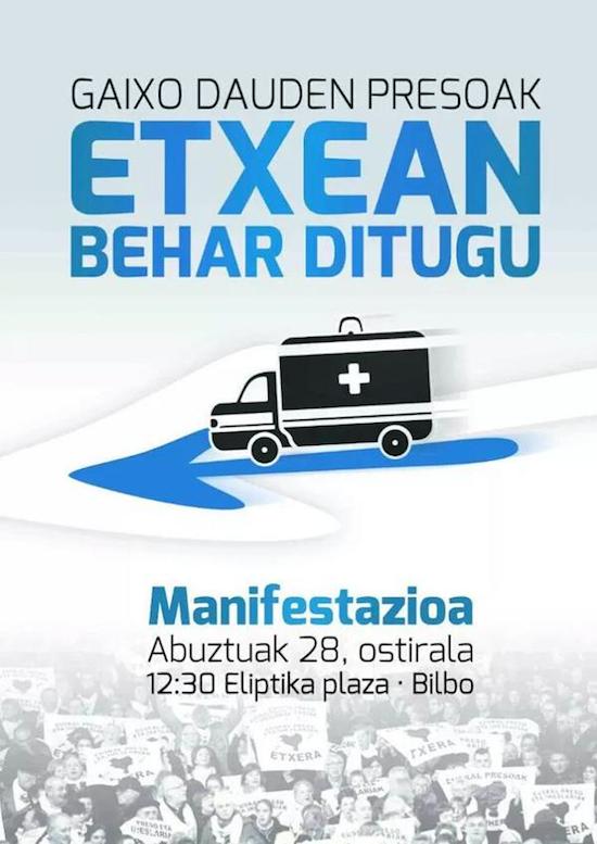 Gaixo dauden Bizkaiko euskal presoen senide eta lagunek manifestazioa antolatu dute datorren abuztuaren 28rako Bilbon. "Gaixo dauden presoak etxean behar ditugu" lelopean osasun eskubidea urratzen duen espainiar zein frantziar estatuen espetxe politika salatuko da.