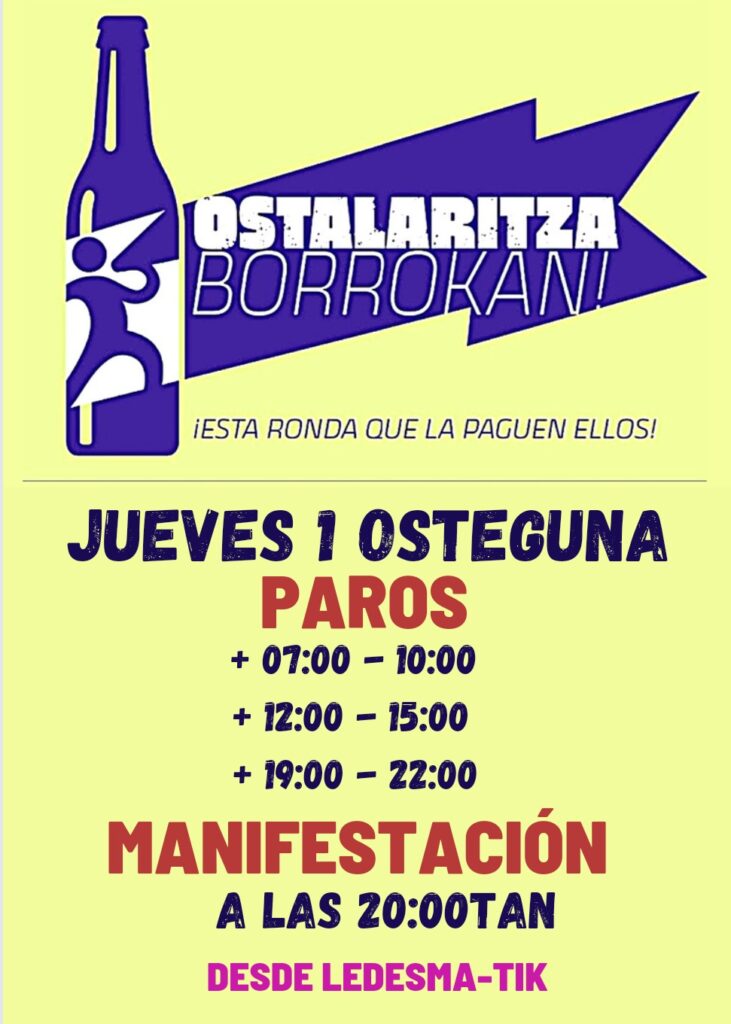 Horregatik guztiagatik, eta askoz gehiagogatik, Bizkaiko Hitzarmenaren Negoziazio Mahaian ordezkaritza dugun sindikatu guztiok deitu ditugu gaurko lanuzteak. Goizean GASCA eta VASCA kolektibitateetako enpresen sukalde nagusietan egin duten bezala, eguerdian herrialdeko hotel nagusien aurrean egongo dira, eta 20:00etatik aurrera Bilboko tabernetako kale nagusiak zeharkatuko dituzte, Ledesmatik abiatuta.