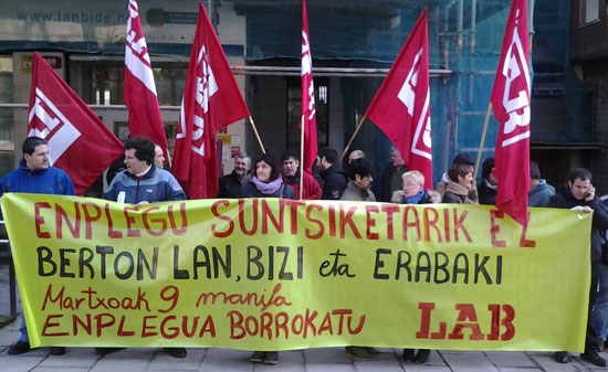 Emergentzi egoerak, enpleguaren aldeko politikak berehala behar dituelako, inoiz baino garrantzitsuagoa da enpleguaren alde kalera ateratzea. Horregatik BUSTURIALDEA ETA LEA ARTIBAIKO LABek BAT EGITEN DU, BORROKAN DAUDEN ENPRESA KOMITEEK, MARTXOAK 9rako deitu duten manifestazioarekin eta eskualdeko langileak eta herritar orori, deitzen diegu, datorren martxoaren 9a, Bilbon Jesusen Bihotzetik aterako den manifestazioan parte hartzera.»