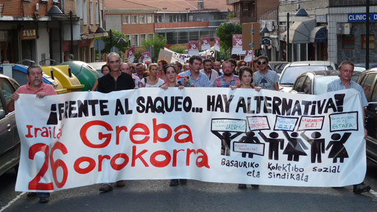 Estas no hacen sino llevar a la miseria a la ciudadanía, mientras se invierte su dinero en "rescatar" a bancos, verdaderos responsables de la crisis financiera. Pero los colectivos sociales y sindicales de Basauri reivindican una manera diferente de hacer las cosas y una política más centrada en las necesidades de las personas, por eso el día 26 de septiembre secundarán la huelga que se ha convocado en Euskal Herria.