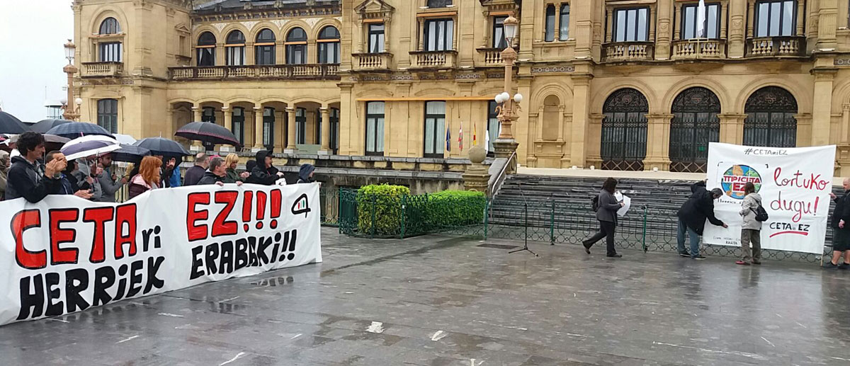 Euskal Herriko Eskubide Sozialen Karta eta Araba, Bizkaia, Gipuzkoa eta Nafarroako TTIP eta CETAren aurkako plataformak kalera irten dira gaur, itunaren eragin kaltegarriaz ohartarazteko. Hain zuzen ere, elkarretaratzeak egin dituzte Bilbon, Iruñean eta Donostian. Gipuzkoako hiriburuan, gainera, horma-irudi kolektibo bat osatu dute Alderdi Ederren.