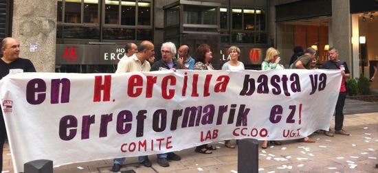 El comité de empresa del Hotel Ercilla ha vuelto a concentrarse hoy a la mañana a las puertas del establecimiento para denunciar la aplicación de la reforma laboral, coincidiendo con el hecho de que el presidente de Confebask, Miguel Ángel Lujua, acudiera al mismo a un evento.
