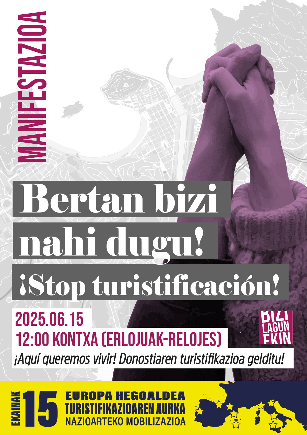 LABetik, herritar oro jasangaitza den egoera honi muga jarri eta langile guztion mesedera jardungo duen hiri ereduaren alde borrokatzera deitzen dugu. Horregatik guztiagatik, ekainaren 15ean Europa hegoaldeko hiri ezberdinetan burutuko diren mobilizazioei gure babesik beroena eman nahi diegu eta bide honetan, BiziLagunEkinek deitutako mobilizazioa gure egin eta igande honetan Donostiako kaleak betetzera dei egiten dugu.