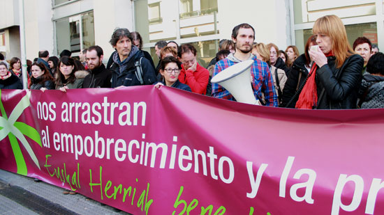 Otsailaren 3an Euskal Herriko eragile sozial eta sindikalek aurkezturiko pobreziaren eta prekarietatearen aurkako kanpainaren baitan, atzo Donostiako LANBIDEren egoitzaren aurrean mobilizatu ziren egungo politika antisozialek biztanleriaren gehiengoaren pobretzea dakarrela salatzeko.