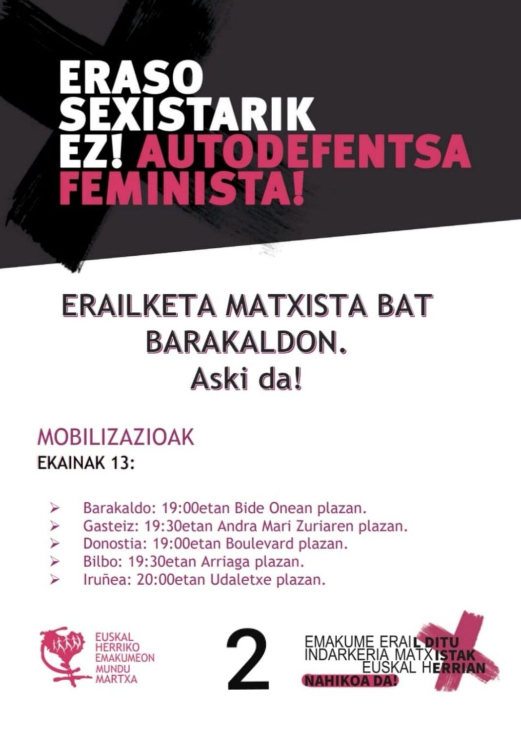 Euskal Herriko Emakumeon Mundu Martxatik gure herrian aurten gertatu den bigarren hilketa matxista hau salatzen dugu. Gure ustez, emakumeon aurkako indarkeria matxistaren erabilera da oraindik ere gizon askok erabiltzen duten arma gure kontra, baita familian bertan emandako indarkeria matxistaren kasuan ere.