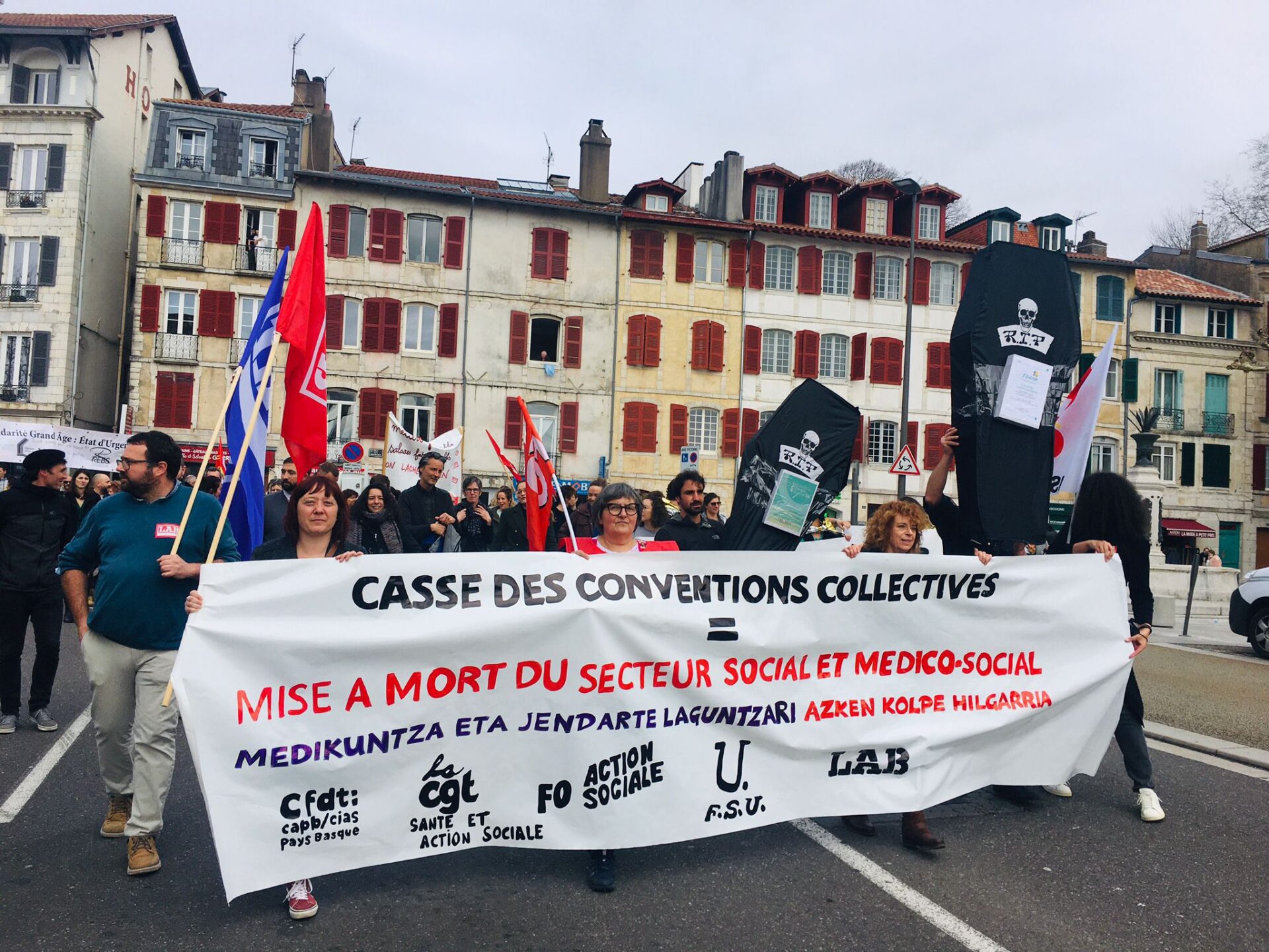 Ipar Euskal Herriko ekintza sozialeko eta medikuntza-sozialeko langileek manifestazioa egin dute Baionan, sektorea kinka larrian dagoela ohartarazteko. Laugarren greba eguna izan da ostegun honetakoa. Jantzi beltzekin irten dira kalera.