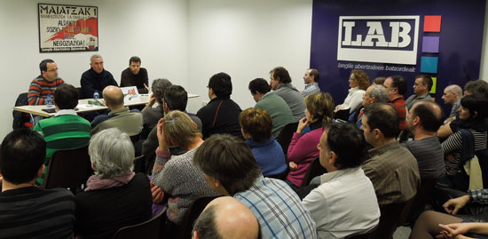 Diego Cañamero portavoz nacional del SAT y Javier García responsable de comunicación han ofrecido 4 charlas en distintos puntos de Euskal Herria. El día 22 de febrero estubieron en Sestao, el 23 en Gasteiz, el 24 en Lizarra y el 25 en Baiona. Unas 250 personas se han acercado a las charlas y han podido conocer de primera mano la lucha del SAT y la represión que está padeciendo por su lucha y compromiso de clase.