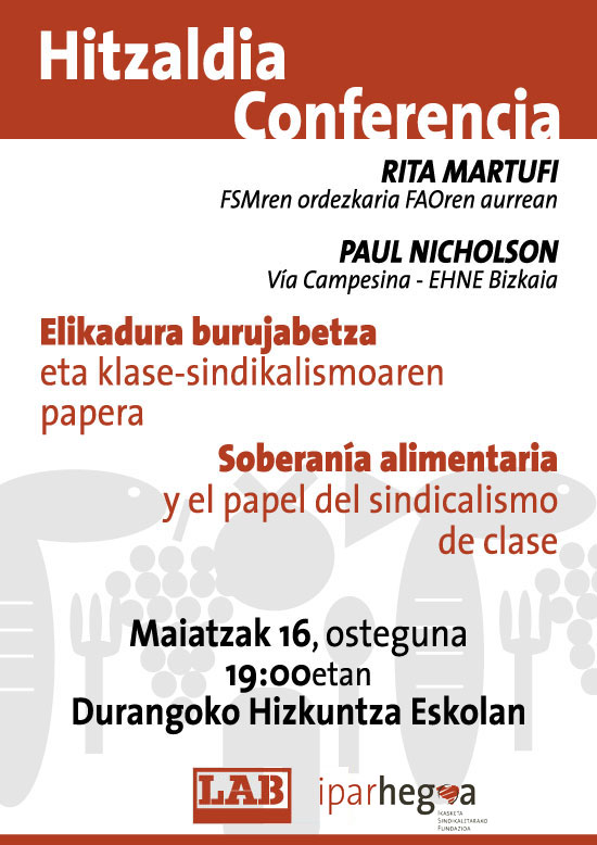 Rita Martufi, FSMren ordezkaria FAOren aurrean, eta Vía Campesina-EHNE Bizkaiko Paul Nicholson-ek "Elikadura subirotasuna eta klase-sindikalismoaren papera" izango dute hizpide LAB sindikatuak eta Ipar Hegoa Fundazioak datorren maiatzaren 16an, arratsaldeko 19:00etan, Durangoko Hizkuntza Eskolan antolatutako hitzaldian.
