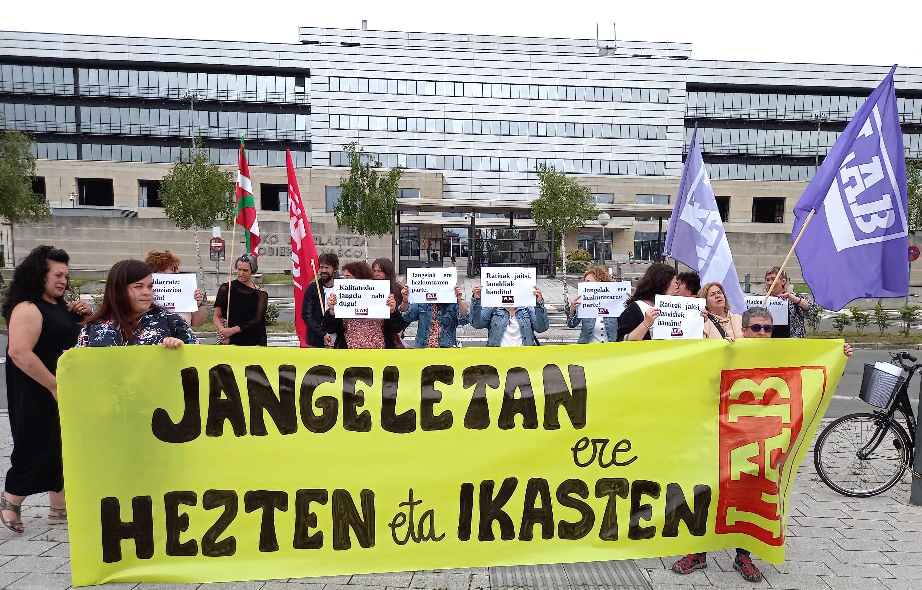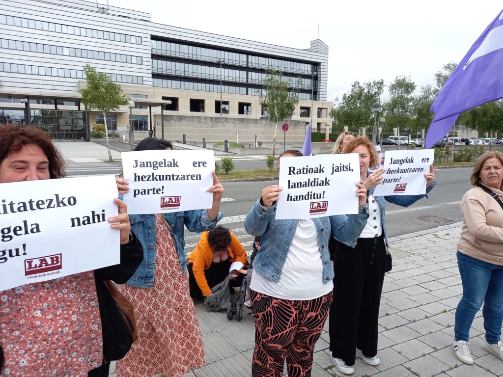Eskola-jantokietako LABeko ordezkariek elkarretaratzea egin dute Lakuan, Gasteizko Gobernuaren egoitzaren aurrean, Hezkuntza Sailari eskatzeko 2000ko martxoaren 22ko Agindua aldatzea, eskola-jantokiak arautzen dituena, eta baita eskola-jangelen funtzianamenduaren inguruko zirkularra aldatzea ere.