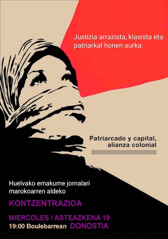 Euskal Herriko Emakumeon Mundu Martxatik Huelvan lan egitera etorri ziren Marokoko emakumeek jasaten dituzten biolentziak epaitu dituen justizia patriarkarra salatzen dugu.