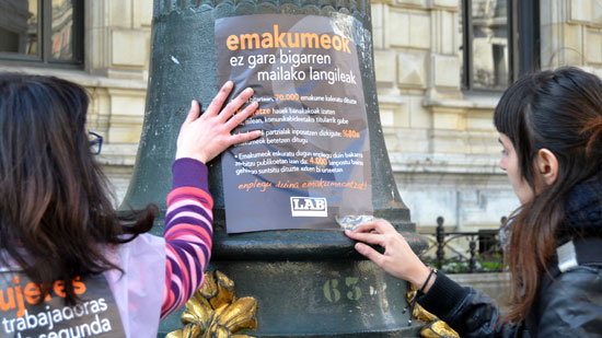 LABeko delegatuek San Martin Merkatuaren aurrean elkarretaratzea egin dute "Enplegu duina emakumeontzat!" lelopean. Mobilizazioari amaiera emateko emakumeok jasan behar dugun zama irudikatzeko lau emakume kateaturik eta hormigoizko bloke bat gainean zutela azaldu dira.