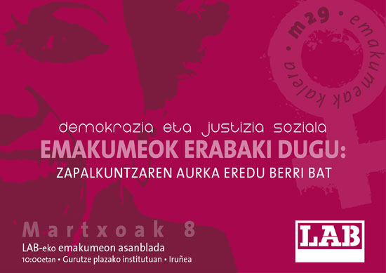 LAB sindikatuak Martxoaren 8an Emakumeon Batzar Orokorra burutuko du lan erreformak emakumeongan izango dituen ondorioak azaldu eta martxoaren 29an kalera ateratzearen garrantzia azpimarratzeko. Batzarra Iruñeako Gurutze Plazako Institutoan izango da goizeko 10:00etan eta bertan Ainhoa Etxaide, Garbiñe Aranburu eta Zaloa Ibeas-ek hartuko dute hitza.