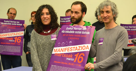 ELA, LAB, ESK, STEE-EILAS, EHNE, HIRU, CGT-LKN eta CNT sindikatuetako ordezkariek, hainbat eragile sozialetako kideekin batera, larunbat honetan, hilak 16, Bilbon, "Por un nuevo modelo social y económico, Euskal herrian lan eta eskubide sozial duinak" lelopean egingo den manifestaziorako deia luzatu dute.