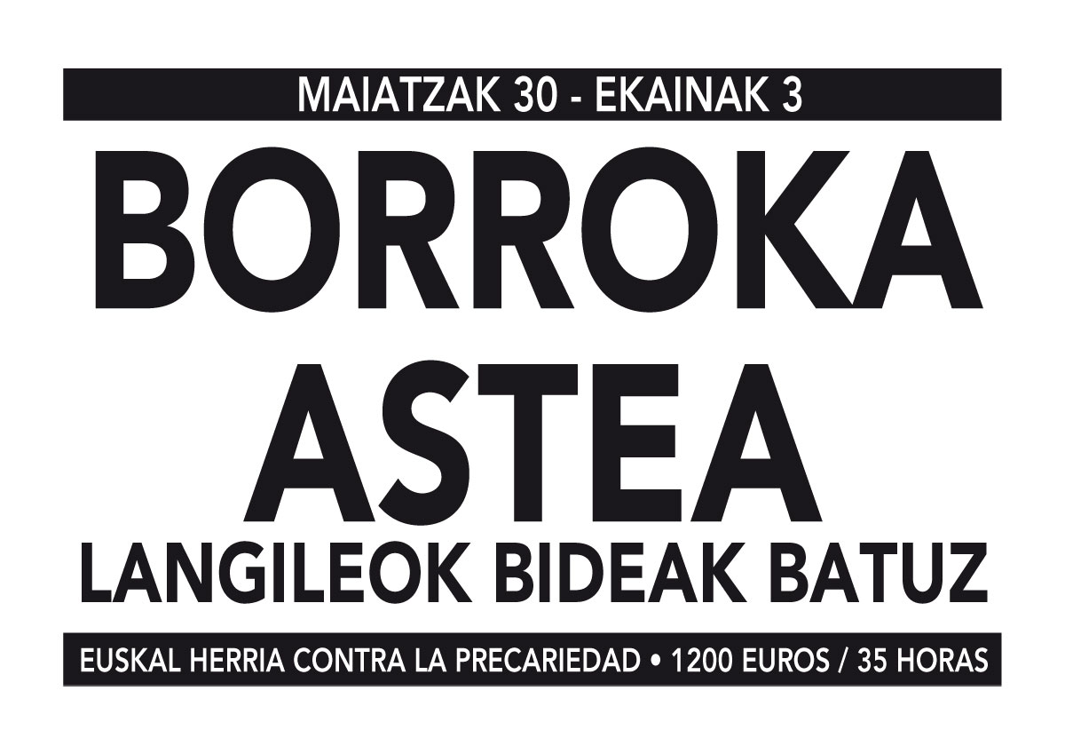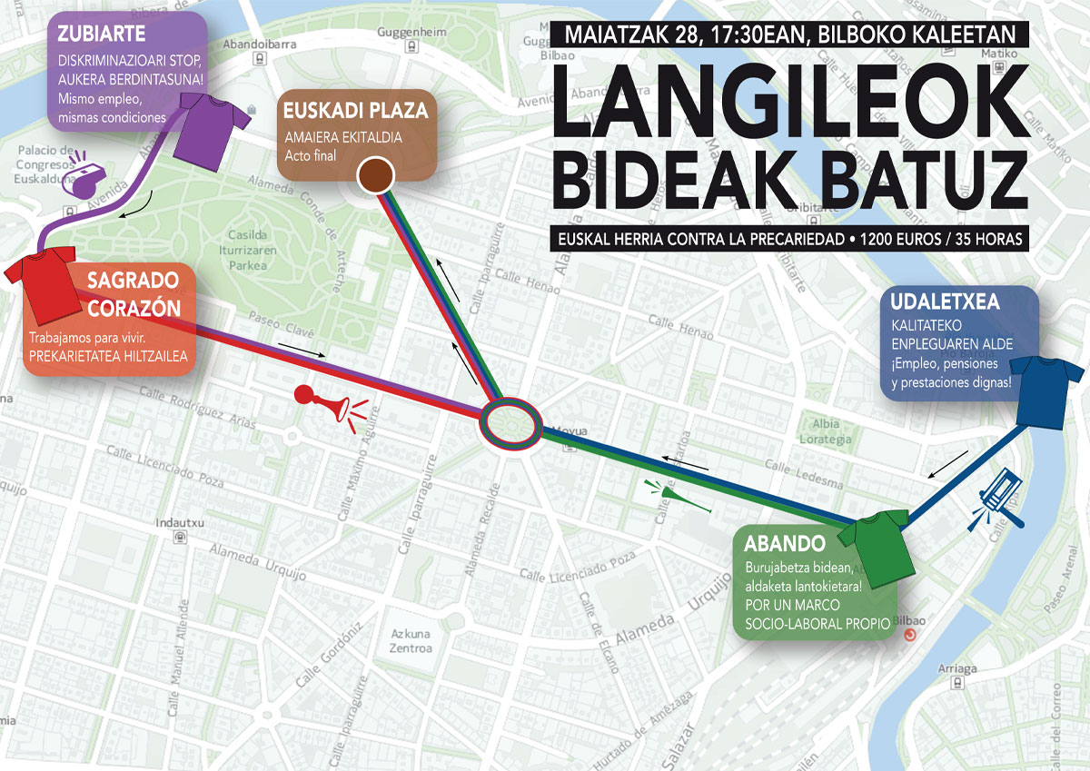 Todas las reivindicaciones se unirán en la plaza Elíptica para dirigirnos seguidamente a la  Plaza Euskadi tras la pancarta que reivindicará el salario mínimo de 1.200 euros y las 35 horas. Para acabar con la precariedad laboral y la pobreza reivindicamos nuevas políticas. Más allá de la simple denuncia, ponemos sobre la mesa propuestas concretas. Mostraremos que un cambio real es posible para Euskal Herria.