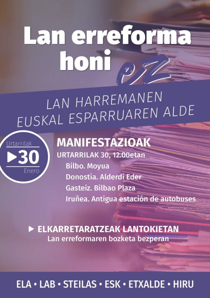 Ha pasado la Jornada de Reivindicación convocada el jueves por LAB, pero nuestras reivindicaciones siguen vigentes. Precisamente el domingo, 30 de enero, y el miércoles, 2 de febrero, volveremos a tomar las calles y los centros de trabajo junto a la mayoría sindical vasca, en contra de esta reforma laboral y en defensa del marco vasco de relaciones laborales.