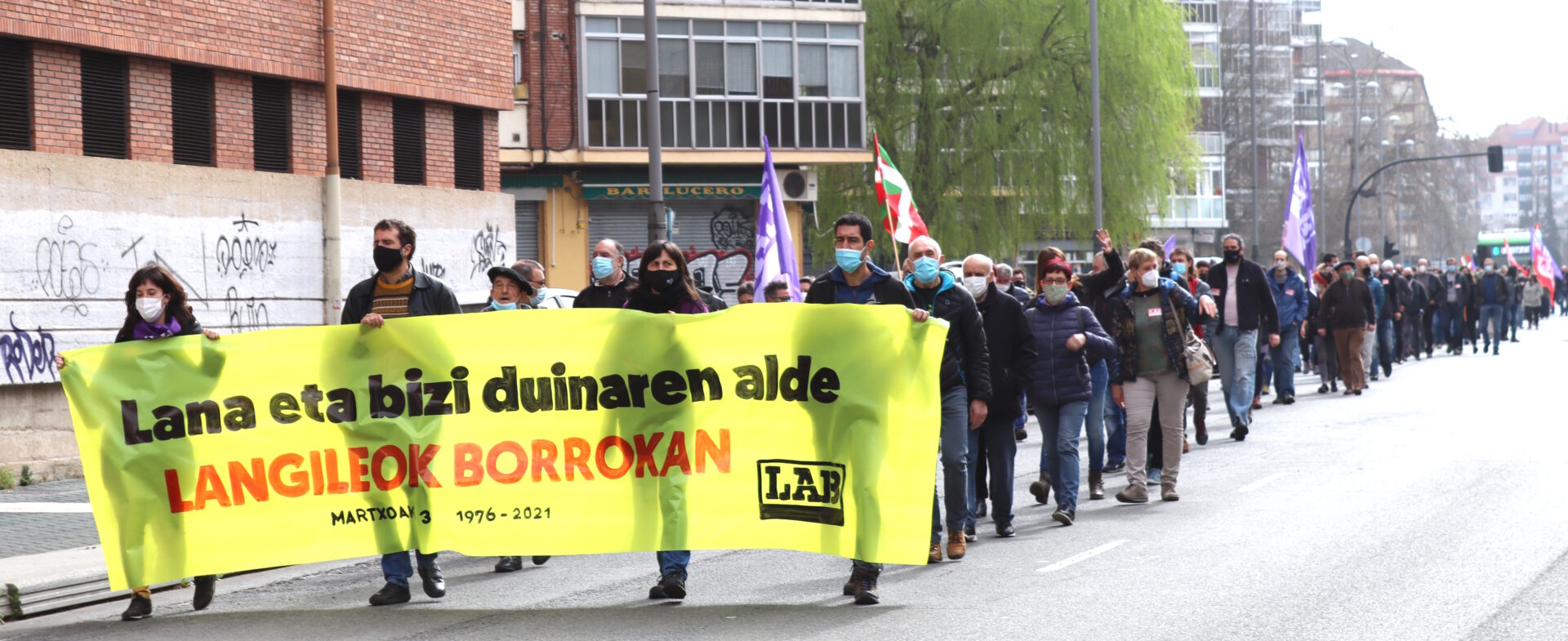 Con la llegada del 3 de marzo, hemos recordado uno de los episodios más dramáticos de la historia de Euskal Herria: el 3 de marzo de 1976, cinco trabajadores fueron asesinados por la Policía española en Gasteiz, en la iglesia de San Francisco de Asís, en el barrio de Zaramaga, tras una asamblea de trabajadoras y trabajadores. Murieron Pedro María Martínez, Francisco Aznar, Romualdo Barroso, José Castillo y Bienvenido Pereda. 45 años después, estas víctimas no han recibido verdad, justicia ni reparación. Ante esta realidad, LAB les ha homenajeado en Gasteiz por la mañana, horas antes de la manifestación convocada para la tarde por la mayoría sindical vasca. Concretamente, hemos llevado a cabo un acto en la plaza 3 de Marzo, reivindicando el trabajo y la vida dignas, poniendo en valor la lucha de las y los trabajadores, especialmente la lucha de las mujeres.