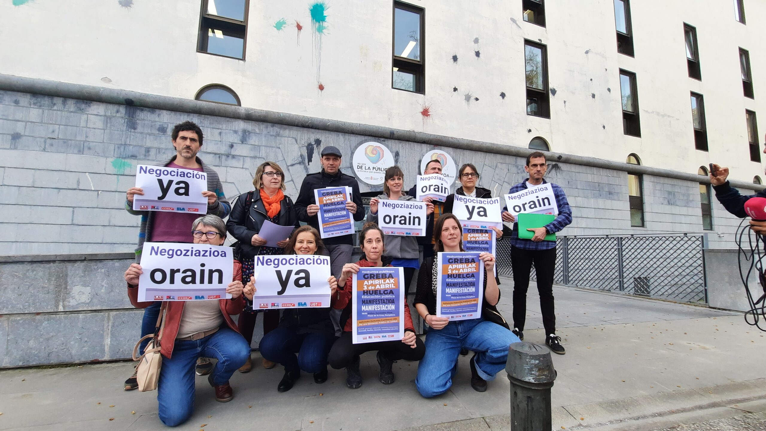Representantes de los sindicatos de enseñanza LAB, Steilas, CCOO, ELA y UGT, convocantes de la huelga del 3 de abril en la educación pública navarra, hemos acudido hoy al Departamento de Educación para registrar el apoyo que han otorgado unos 80 claustros de toda Navarra a las reivindicaciones del paro: bajada de ratios, disminución de la carga de trabajo, reducción de la temporalidad y recuperación del poder adquisitivo.