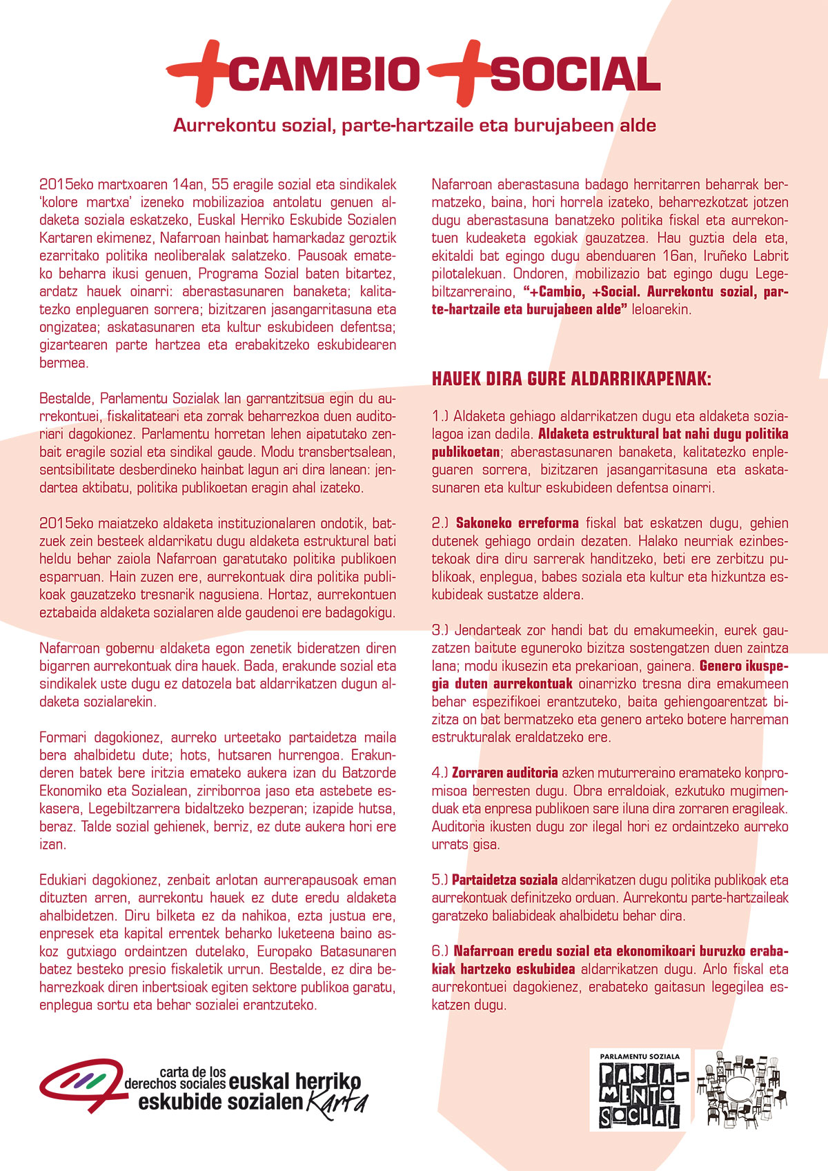 La Carta de Derechos Sociales de Euskal Herria y el Parlamento Social, donde confluyen los sindicatos LAB, ELA, STEILAS, CGT y ESK y agentes sociales como Attac, Bilgune Feminista, Plataforma Navarra de Salud o Martes al Sol, han anunciado hoy la celebración de un acto en el frontón Labrit y posterior manifestación bajo el lema "+Cambio +Social".