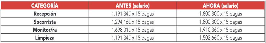 – 2023: Incremento del 12% respecto a las tablas salariales del convenio de Polideportivos del año 2012.