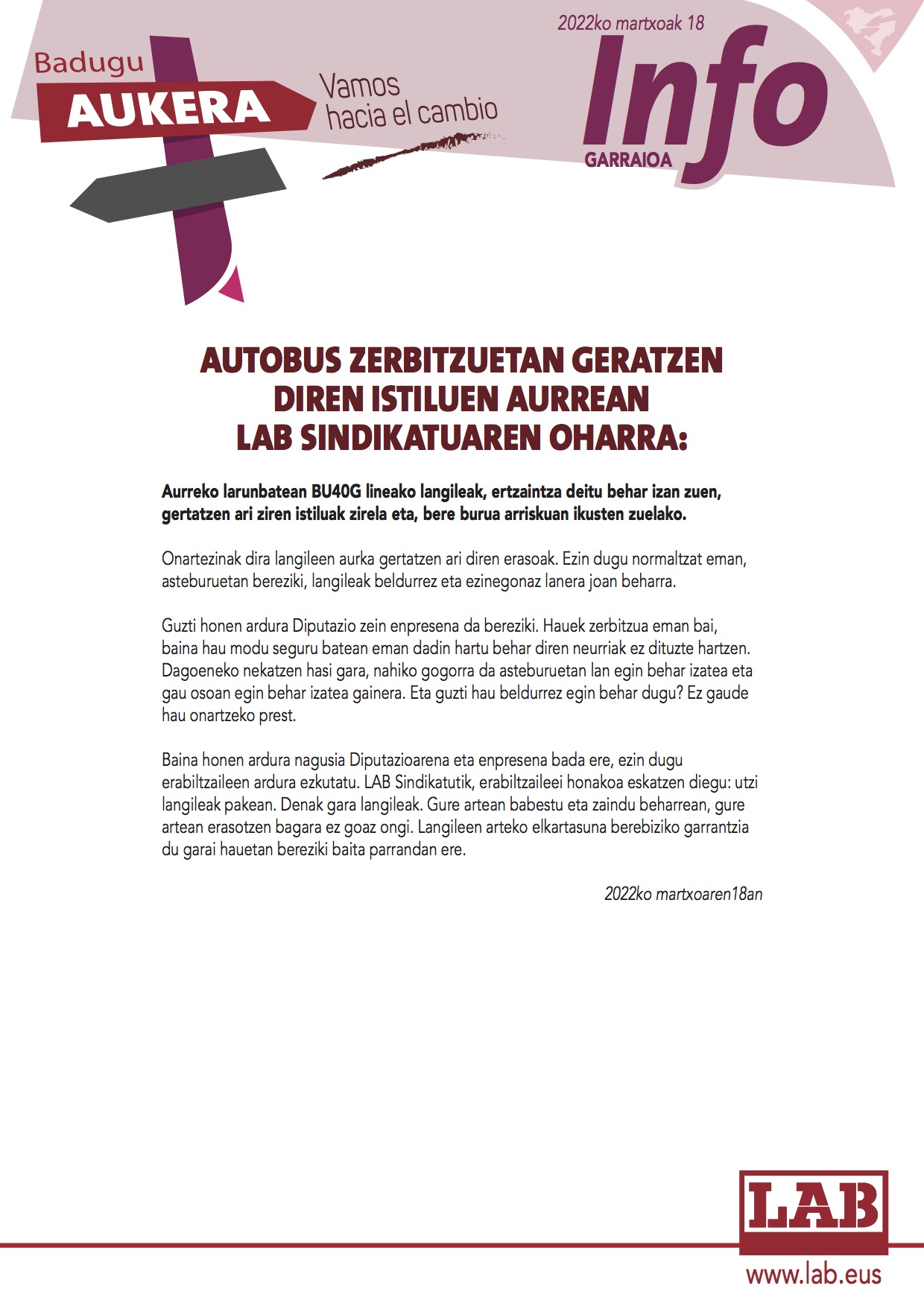Baina honen ardura nagusia Aldundiarena eta enpresena bada ere, ezin dugu erabiltzaileen ardura ezkutatu. LAB sindikatutik, erabiltzaileei honakoa eskatzen diegu: utzi langileak pakean. Denak gara langileak. Gure artean babestu eta zaindu beharrean, gure artean erasotzen bagara ez goaz ongi. Langileen arteko elkartasuna berebiziko garrantzia du garai hauetan bereziki, baita parrandan ere.