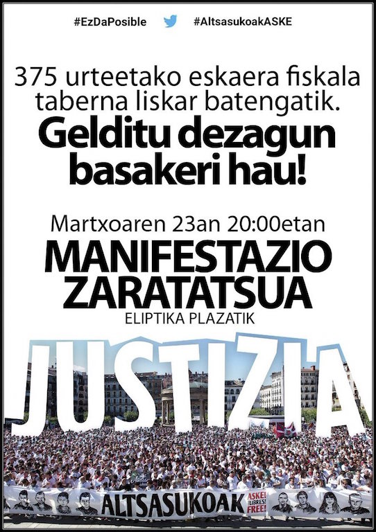 Manifestazio zaratatsu batera deitu dute martxoaren 23rako. Eliptika plazatik irtengo da, 20:00etan. Hain zuzen ere, hainbat eremuko lagunak batu egin dira deialdia egiteko. "Altsasuko gazteen epaiketaren testuinguruan, eurek mobilizazio eskaera luzatu eta guk enplazamenduari heldu eta, Bilboko jendarte osoari zabaldu nahi diogu, basakeria honen aurrean mobilizatzearen premia", adierazi dute.
